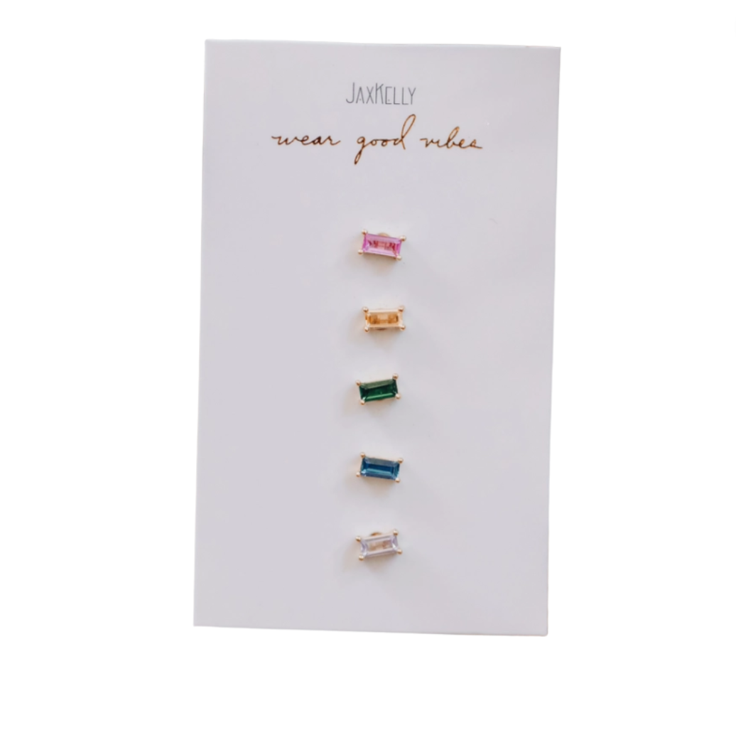 A classic baguette cut for just a flash of color. Made for stacking, layer in this definitive shape for a fresh new take. We've taken the guess work out of a perfect pairing.  Hand-crafted, 18k gold vermeil, Sterling silver base, CZ Cubic zirconia stone.