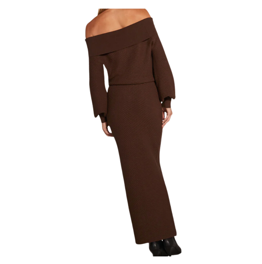 A flattering-for-all dress made from knitted, ribbed viscose blend. The Irene Dress is designed with a blousy top and off-the-shoulder styling with a slim skirt. Since it's cast in a neutral light brown, it will be a favorite dress to wear year round with different accessories.