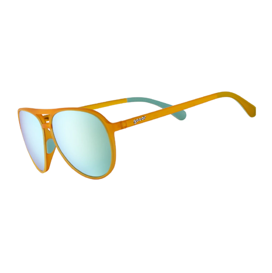 Orange you glad you found these Mach G sunglasses?! They're aviator frames. But that doesn't qualify YOU to fly the plane!!! This is Colby, your Cheesy Flight Attendant. Get it? Colby Jack?!?! That was a thinker. Psst! Everybody on staff knows you like to get high. In the air. By booking a plane ticket!!! These sunnies won't slip or bounce while we crash into a mountain. Kidding, kidding! Laugh a little, will ya?!?! Life is short. Really short, considering how drunk the pilot is right now. J/K! J/K! Geez!!!!