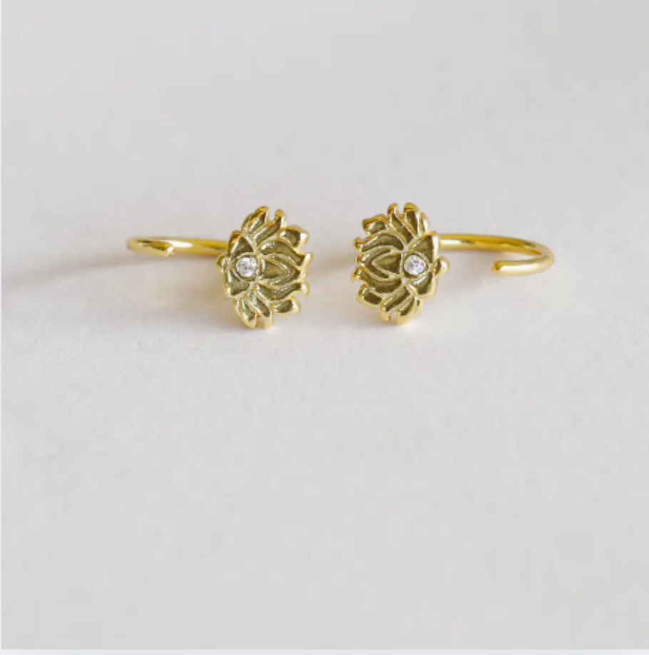 These Huggies feature a gold lotus flower that hugs tight to your ear. Loop the non-stone end through like you would a regular post, and let the stone sit against your ear. Tarnish Free - Long lasting protective coating safeguarding your jewelry from sweat, water, and more. Sterling Silver – 18K gold plating. Hypoallergenic – Lead Free. Outer Diameter 11mm